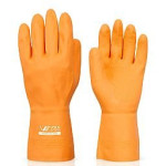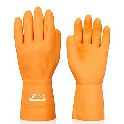 Luva de segurança confeccionada em látex natural, revestimento interno em flocos de algodão, relevo antiderrapante da face palmar e face palmar dos dedos.