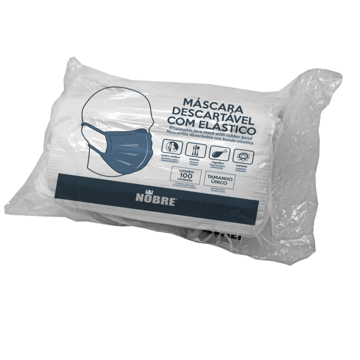 Máscara descartável não estéril; Com elástico; Com clipe nasal que proporciona melhor vedação durante o uso; Máscara Dupla; Produto não indicado para área da saúde.