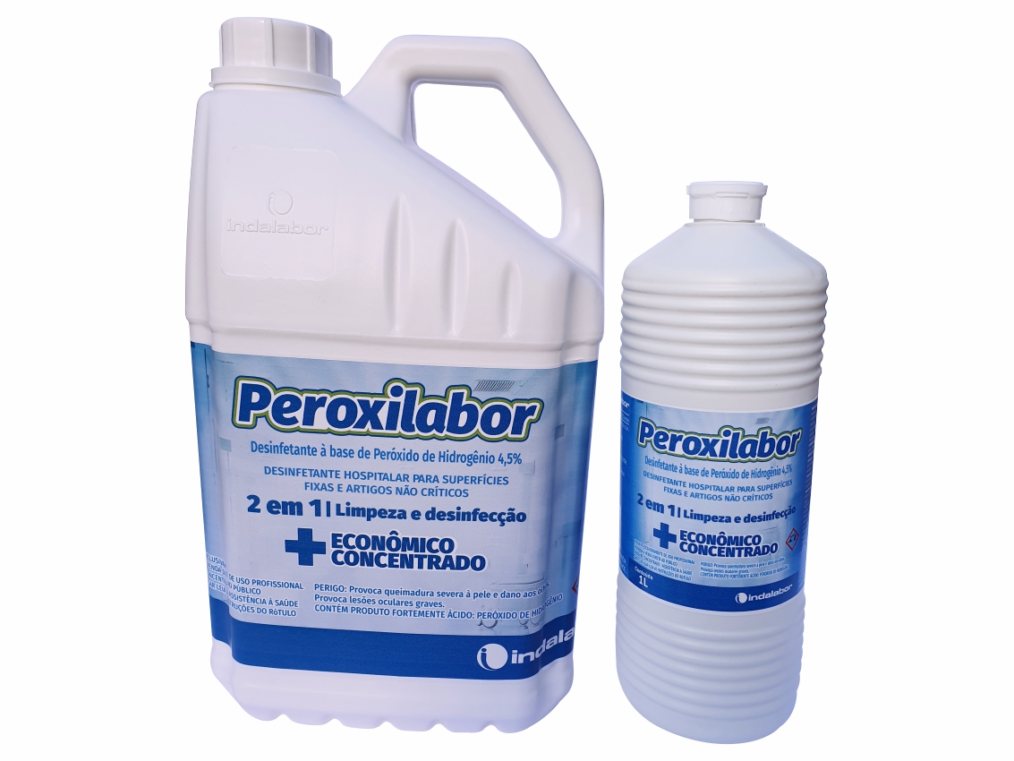 Indicação: PEROXILABOR é um desinfetante concentrado, a base de Peróxido de Hidrogênio, indicado para limpeza e desinfecção em um único procedimento, em estabelecimentos de assistência à saúde (Hospitais, Laboratórios e Clínicas), incluindo áreas críticas. Recomendado para artigos em aço cirúrgico, aço inox, acrílico, alumínio, borracha de silicone, ferro galvanizado, ferro, látex, pvc, vidro e tubo corrugado, além de superfícies, como pisos, azulejos, mesas, bancadas, paredes e mobílias, revestimentos em vinil, emborrachados, linóleo, porcelanatos, plásticos como PET, PP e polietileno. Eficácia comprovada contra: Staphylococcus aureus, Salmonella choleraesuis e Pseudomonas aeruginosa.