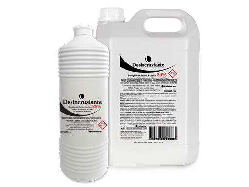 Indicação: Solução aquosa a base de Ácido Acético 20%. O DESINCRUSTANTE é utilizado para remoção de incrustações alcalinas, do sistema interno em máquinas de hemodiálise em unidades de saúde. Remover ferrugem, manchas e crostas em instrumentos de aço inox (bandejas, mesas, macas, cubas, paredes de autoclaves e etc).