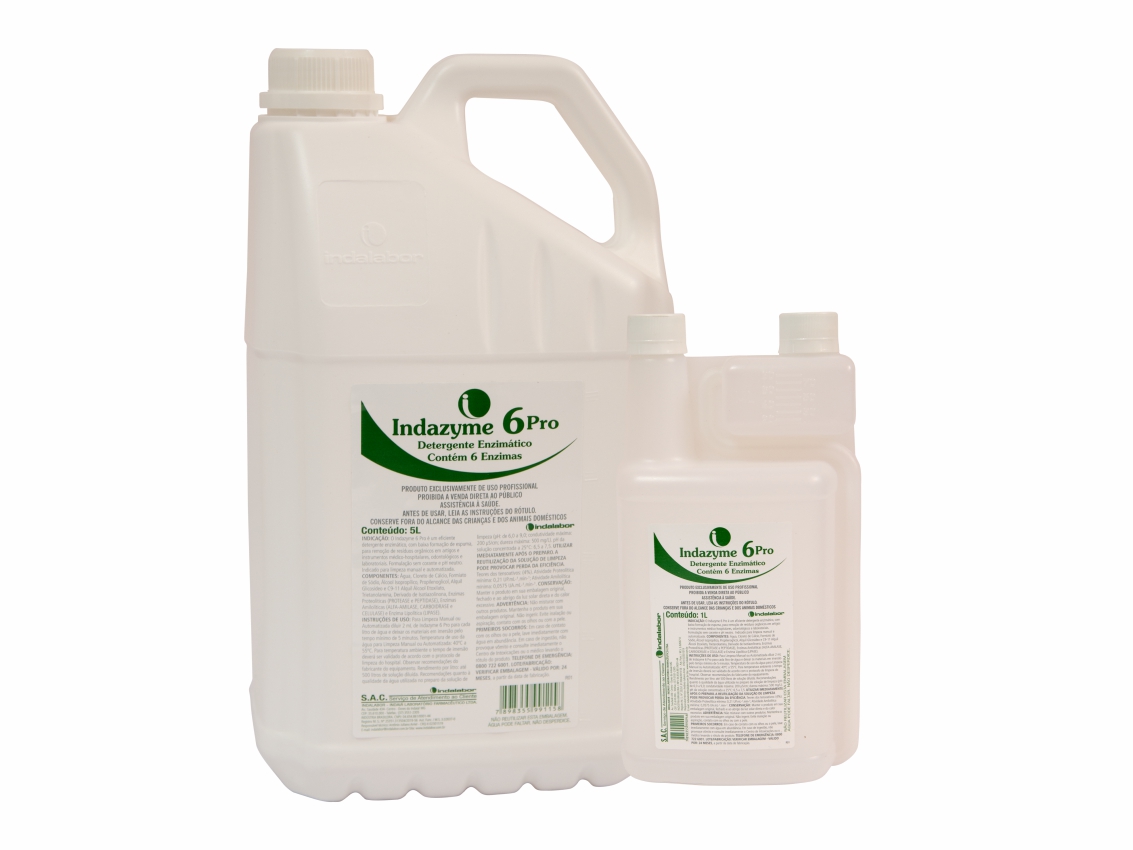 Indicação: O Indazyme 6 Pro é um eficiente detergente enzimático, com baixa formação de espuma, para remoção de resíduos orgânicos em artigos e instrumentos médico-hospitalares, odontológicos e laboratoriais. Formulação sem corante e pH neutro. Indicado para limpeza manual e automatizada.