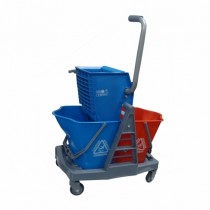 BALDE COM ESPREMEDOR 32L DUPLO: Conjunto composto por 2 baldes plásticos com capacidade total de 16 litros cada, acoplados em um carro com rodas e um espremedor de pressão horizontal. Disponível na cor: balde azul,vermelho,amarelo e verde com carro cinza.